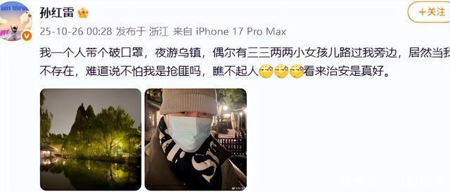 再说说雷哥吧,他好像非常清楚自己在观众心中的形象,他的文案是这样的: “我一个人带个破口罩,夜游乌镇,偶尔有三三两两小女孩儿路过我旁边,居然当我不存在,难道说不怕我是抢匪吗,瞧不起人。”